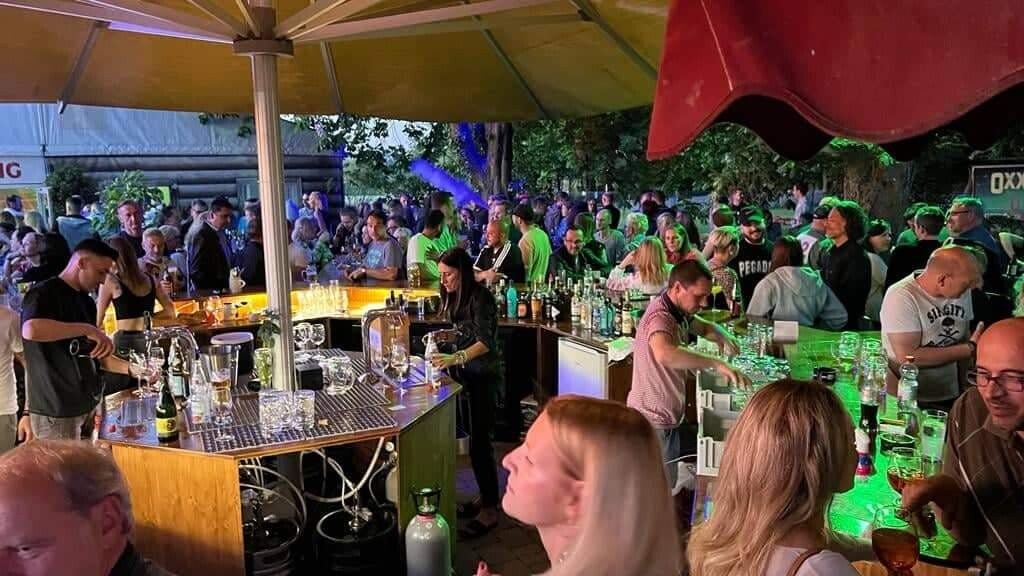 Großer Biergarten mit vielfältigen Getränken, entspannter Atmosphäre und viel Platz im Freien.